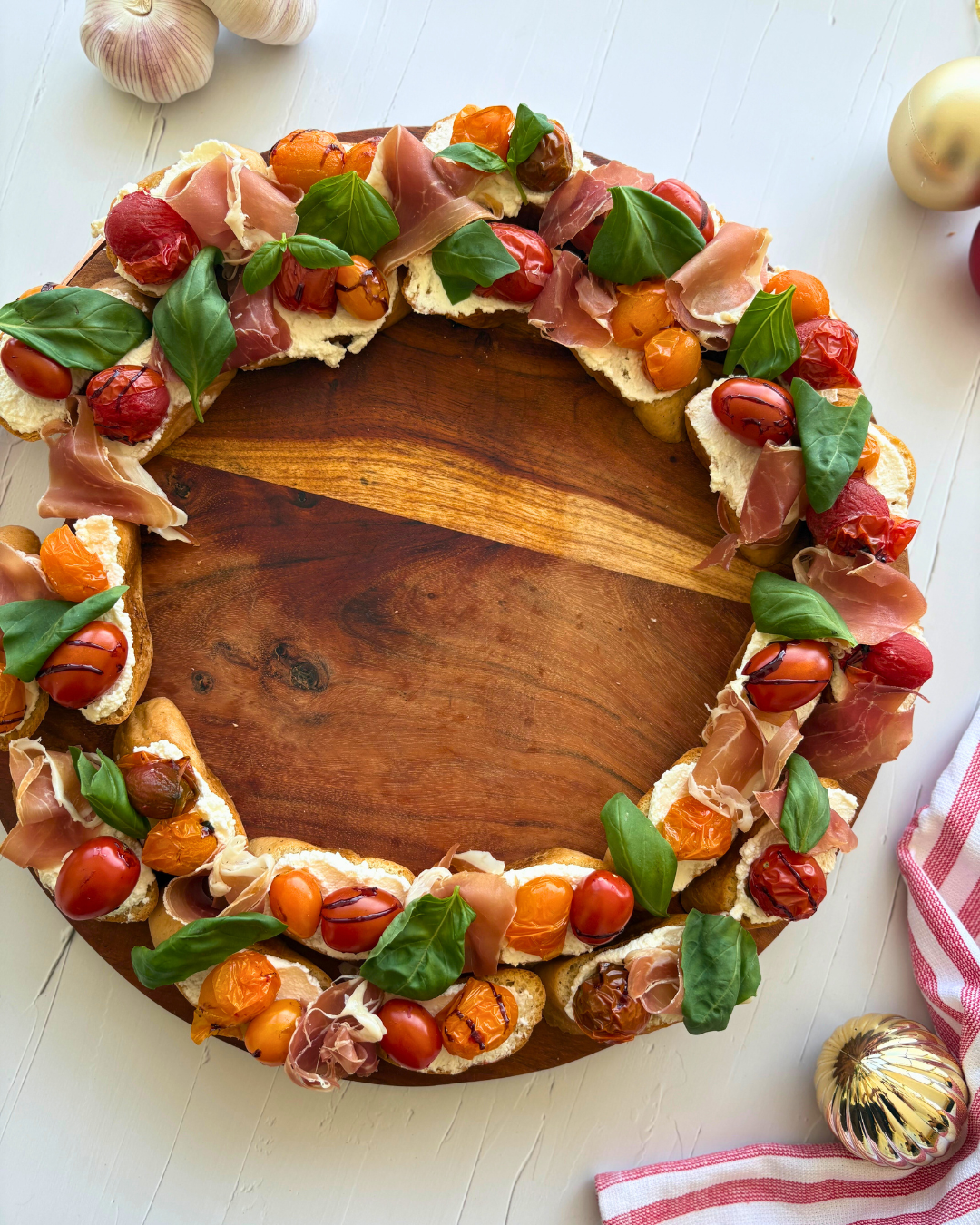 4. Assemble the wreath: Arrange the ricotta-topped crostini in a circle on a round board to create a wreath shape. Tuck in the blistered tomatoes, pieces of prosciutto, and fresh basil leaves.