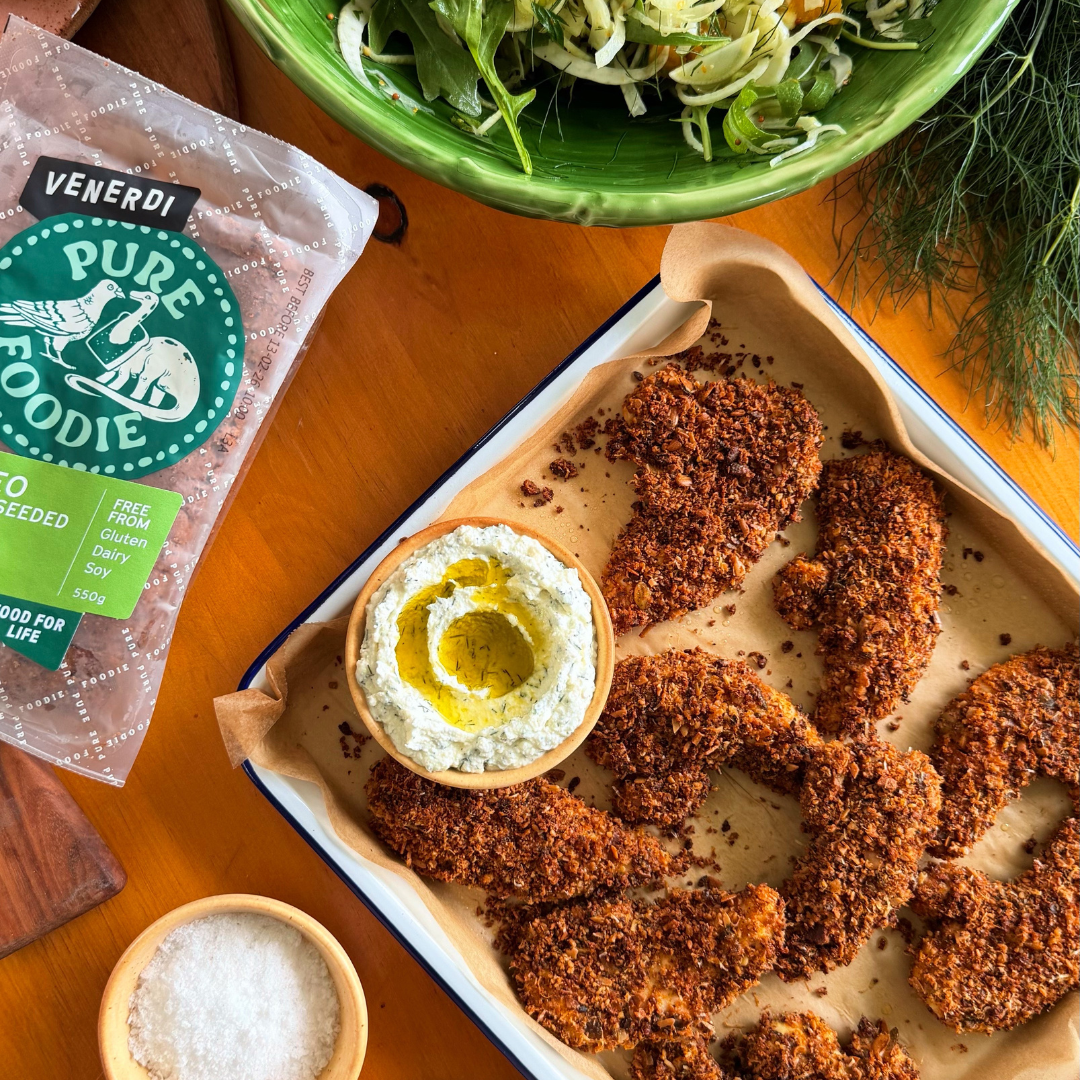 - Crumb and bake the chicken: Place the rice flour in a shallow bowl and season well with salt and pepper. In another bowl whisk the eggs. Coat chicken first in the flour, then egg, then press firmly into the seeded crumb on the tray until well coated. Transfer to the lined tray in a single layer and bake for 20–25 minutes until golden, crispy and cooked through.